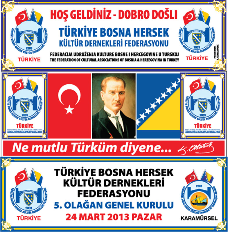 Türkiye Bosna Hersek Kültür Dernekleri Federasyonumuzun 5. Olağan Genel Kurulu, Karamürsel Bosna Hersek Türkleri Kültür Yardımlaşma Derneği’nin ev sahipliğinde Karamürsel’de toplandı. Karamürsel Belediyesi Kültür Merkezi’ndeki toplantıda tek liste ile seçime gidildi. TBHKDF Başkanı Muzaffer Güneş görevini Karamürsel Bosna Hersek Türkleri Kültür Yardımlaşma Derneği Önceki Dönem Başkanı Ahmet Utaş’a devretti.
