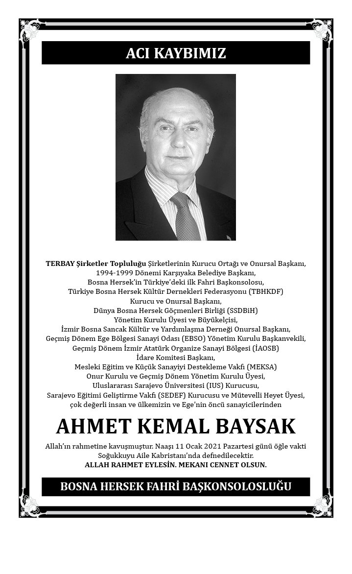 Bosna Hersek Fahri Başkonsolosu, duayen sanayici, iş insanı ve eski Karşıyaka Belediye Başkanı Ahmet Kemal Baysak yaşama veda etti. Baysak’ın vefatı, yalnızca Türkiye ve Bosna Hersek’te değil, Balkanlar’da, Kırım’da ve tüm Türk dünyasında büyük üzüntü yarattı.
